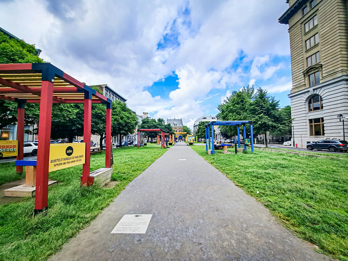 Old-world plaza surrounded by quaint cafes, featuring a commemorative column & a summertime eatery.