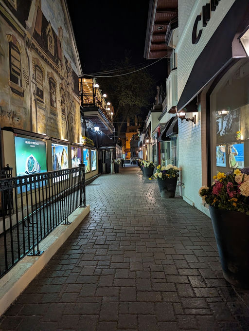 Upscale shops & restaurants surround this small open space & events site with a fountain.