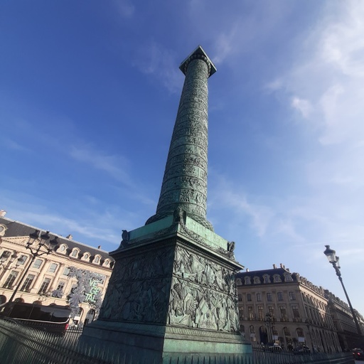 Bronze column standing as a war memorial, with bas-relief carvings topped by a statue of Napoleon.