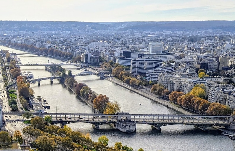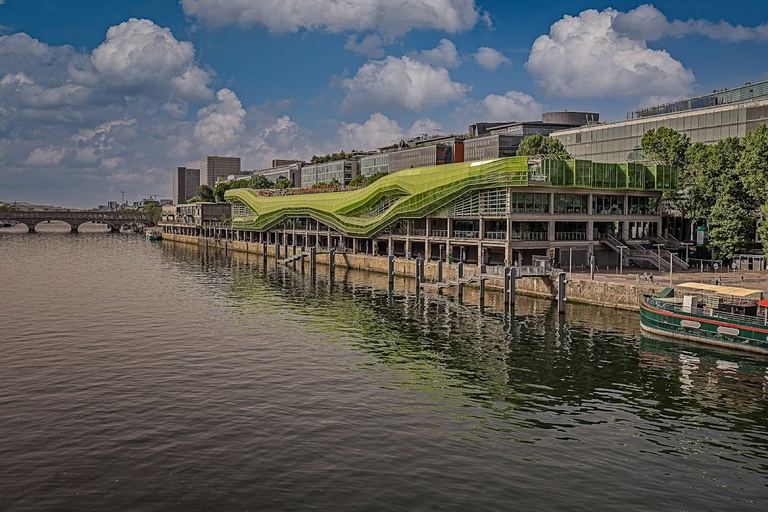 Undulating bridge spanning the River Seine, with 2 different levels for pedestrians & cyclists.