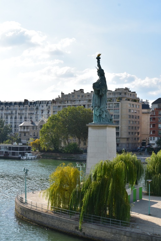 Replica of the Statue of Liberty standing nearly 38 feet on a River Seine island, unveiled in 1889.