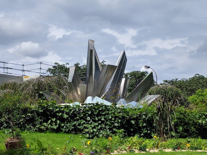 Leafy, man-made islet with a mini Statue of Liberty replica, fitness equipment & Eiffel Tower views.