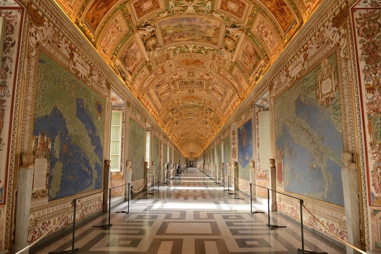 This long hallway is part of a famous museum and is lined with huge, colorful maps painted right onto the walls. The maps show different regions and cities, all created in the late 1500s. The ceiling is covered in detailed artwork too, making the whole place feel like a giant art piece.