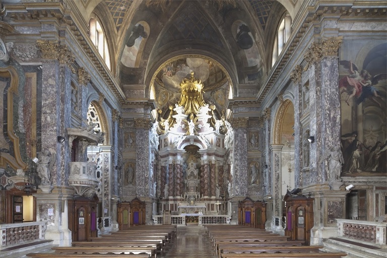 - The main altar and side chapels are decorated with intricate marble and gold details.
